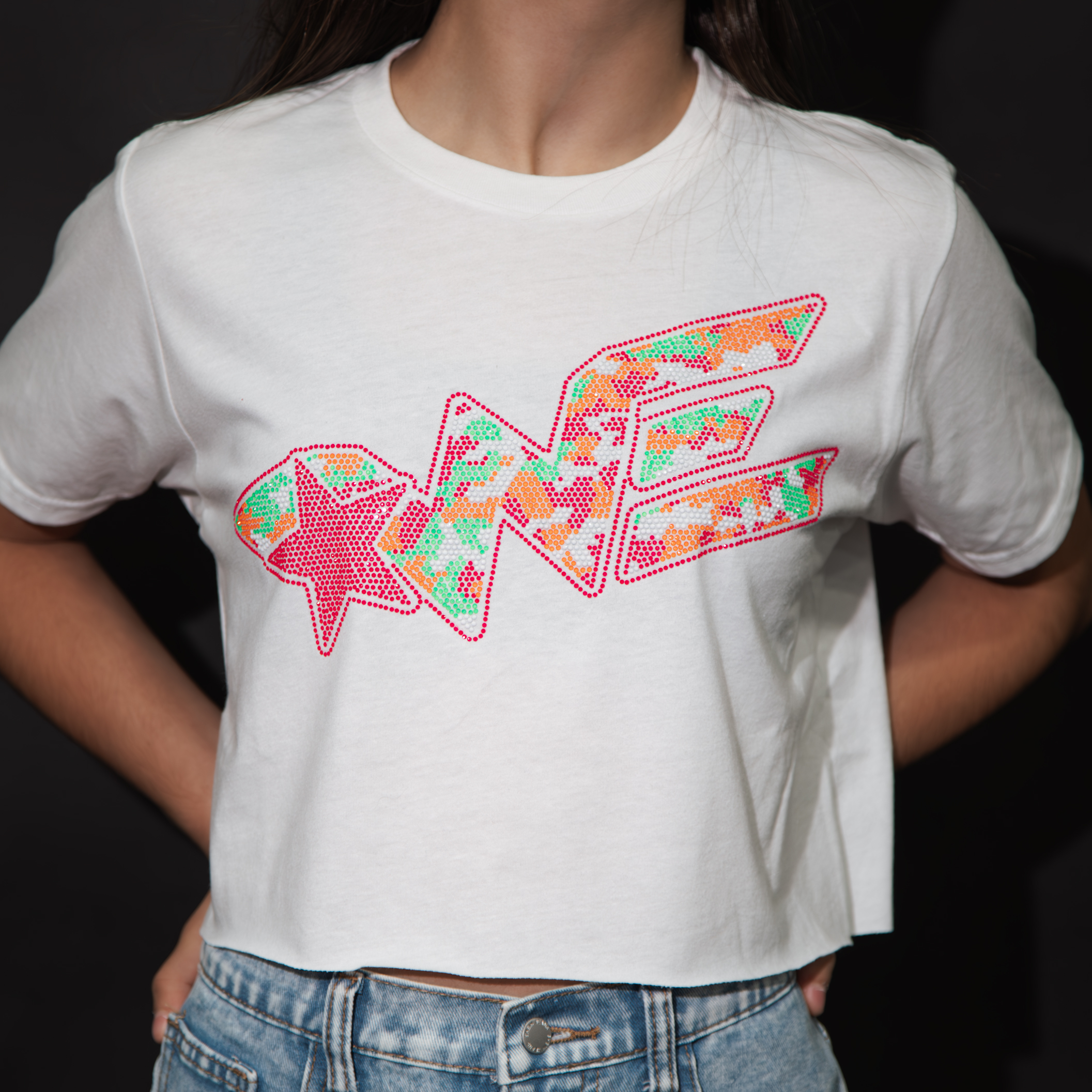 Custom neon camo bling logo items. Available in youth crop tees, short sleeve tees and crewneck sweatshirts with the camo logo or the camo logo with heart. Choose your favorite style. All sizes are unisex sizing. Item is made to order so please allow up to 2 weeks to ship.