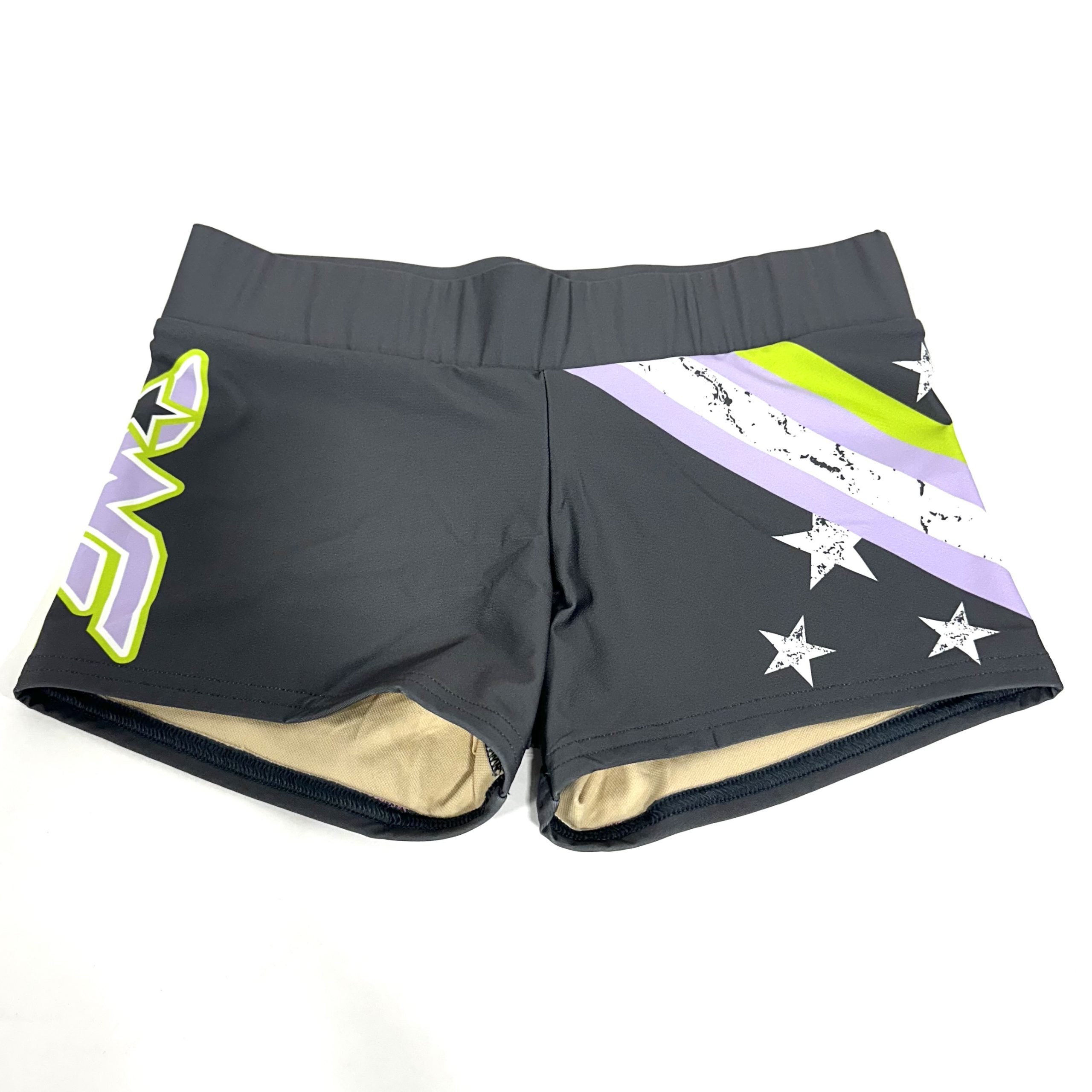 Sublimated grey and lavender spanks with WE logo and stars. Runs 1 size small.