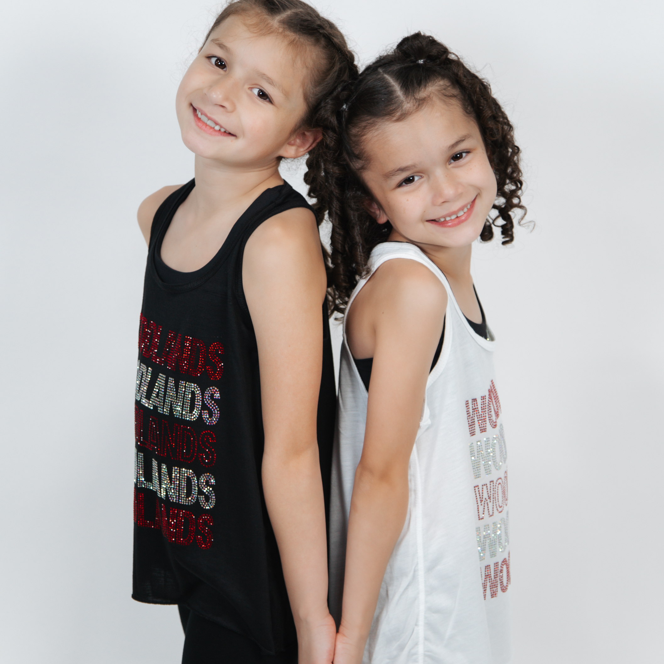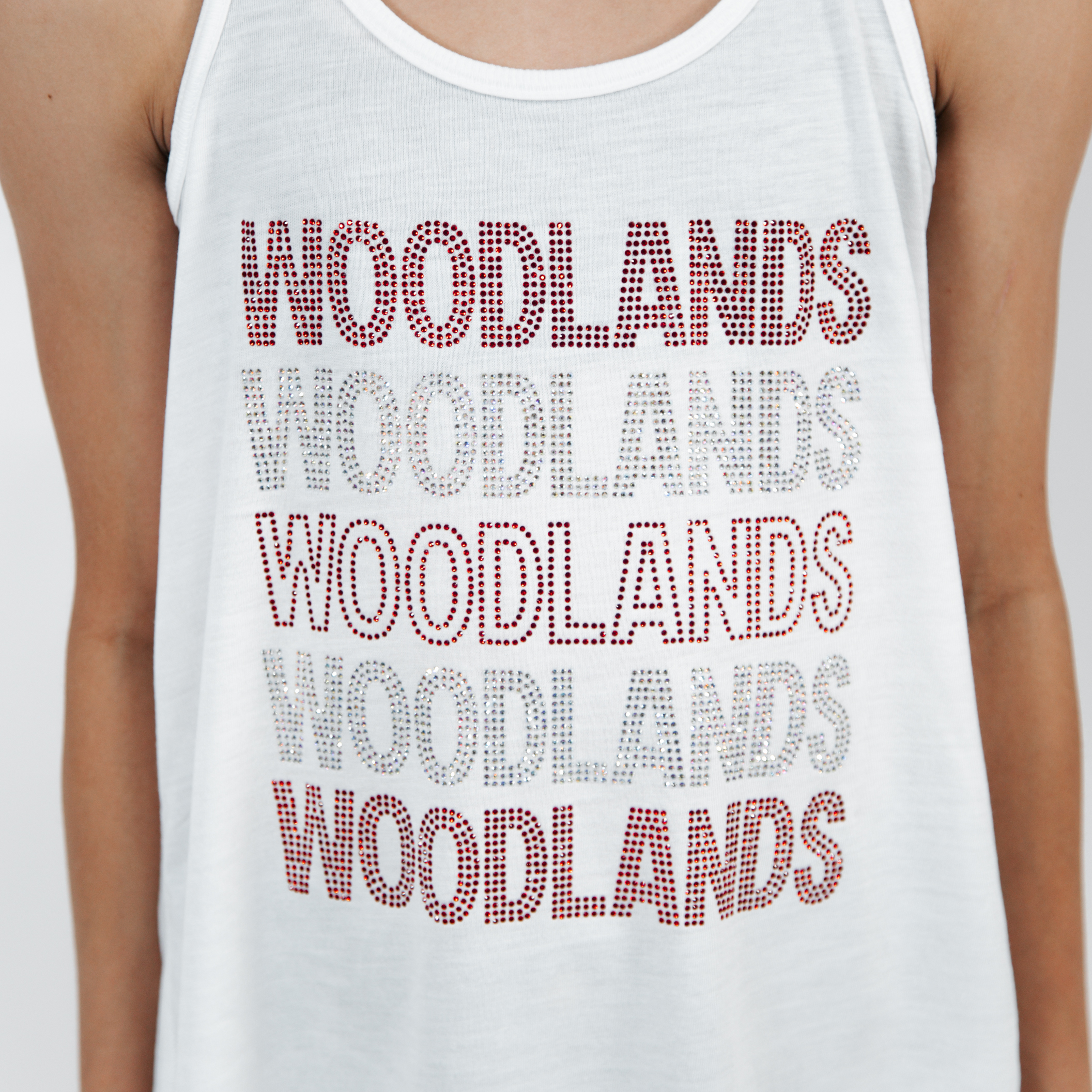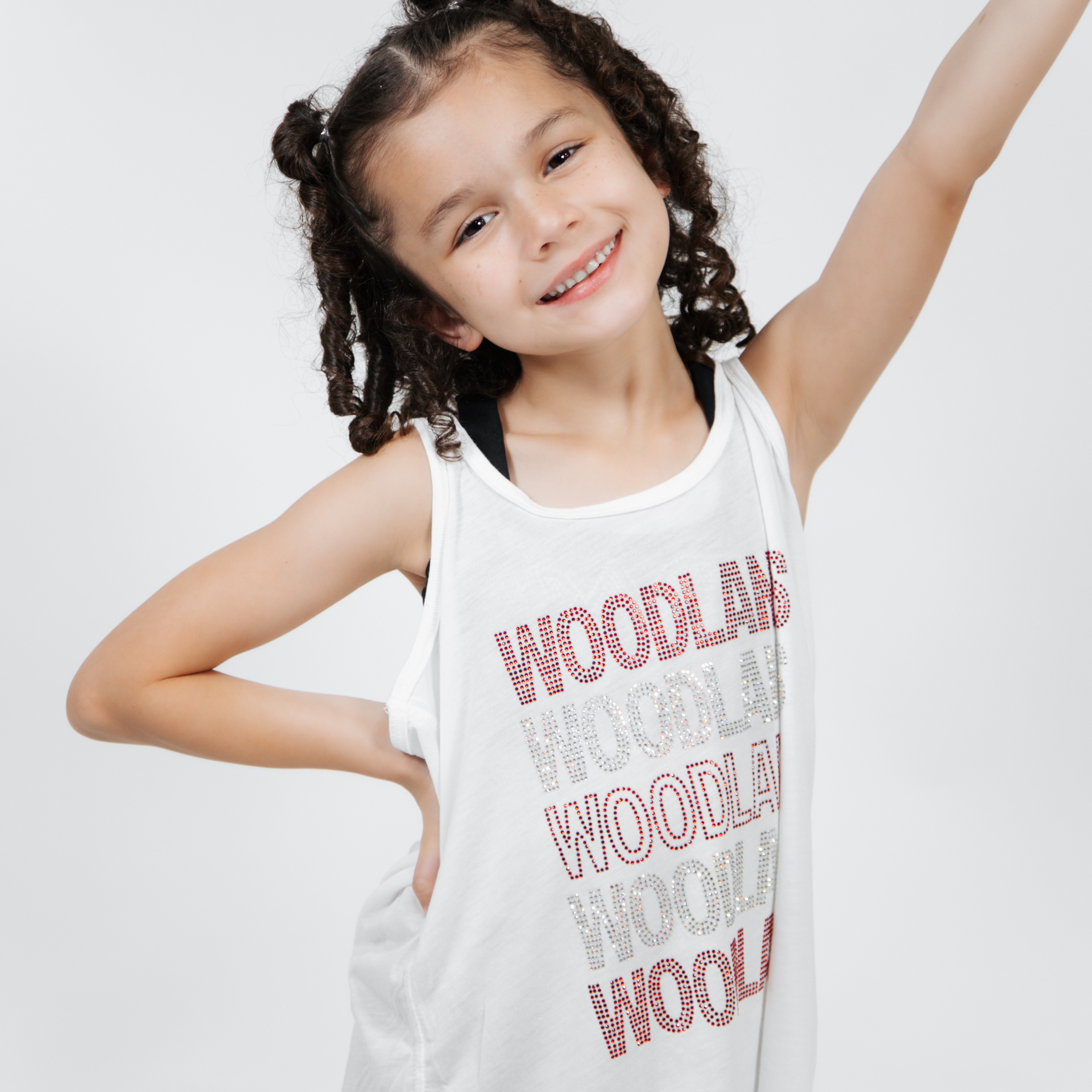 White flowy youth racerback tank with Woodlands repeating bling logo.